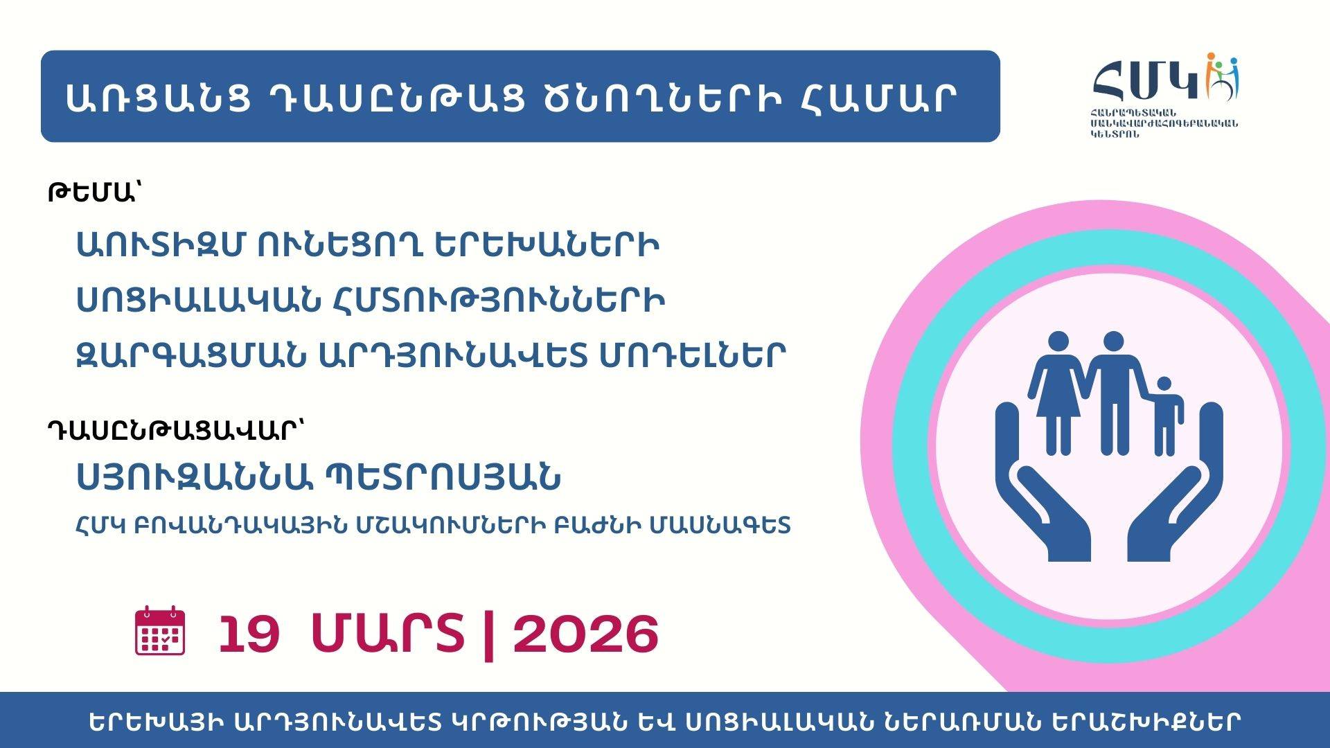 2026թ․մարտի 19-ին, Ժամը` 20։00-21։30, առցանց ձևաչափով տեղի կունենա «ԱՈՒՏԻԶՄ ՈՒՆԵՑՈՂ ԵՐԵԽԱՆԵՐԻ ՍՈՑԻԱԼԱԿԱՆ ՀՄՏՈՒԹՅՈՒՆՆԵՐԻ ԶԱՐԳԱՑՄԱՆ ԱՐԴՅՈՒՆԱՎԵՏ ՄՈԴԵԼՆԵՐ» թեմայով առցանց դասընթաց ծնողների համար։