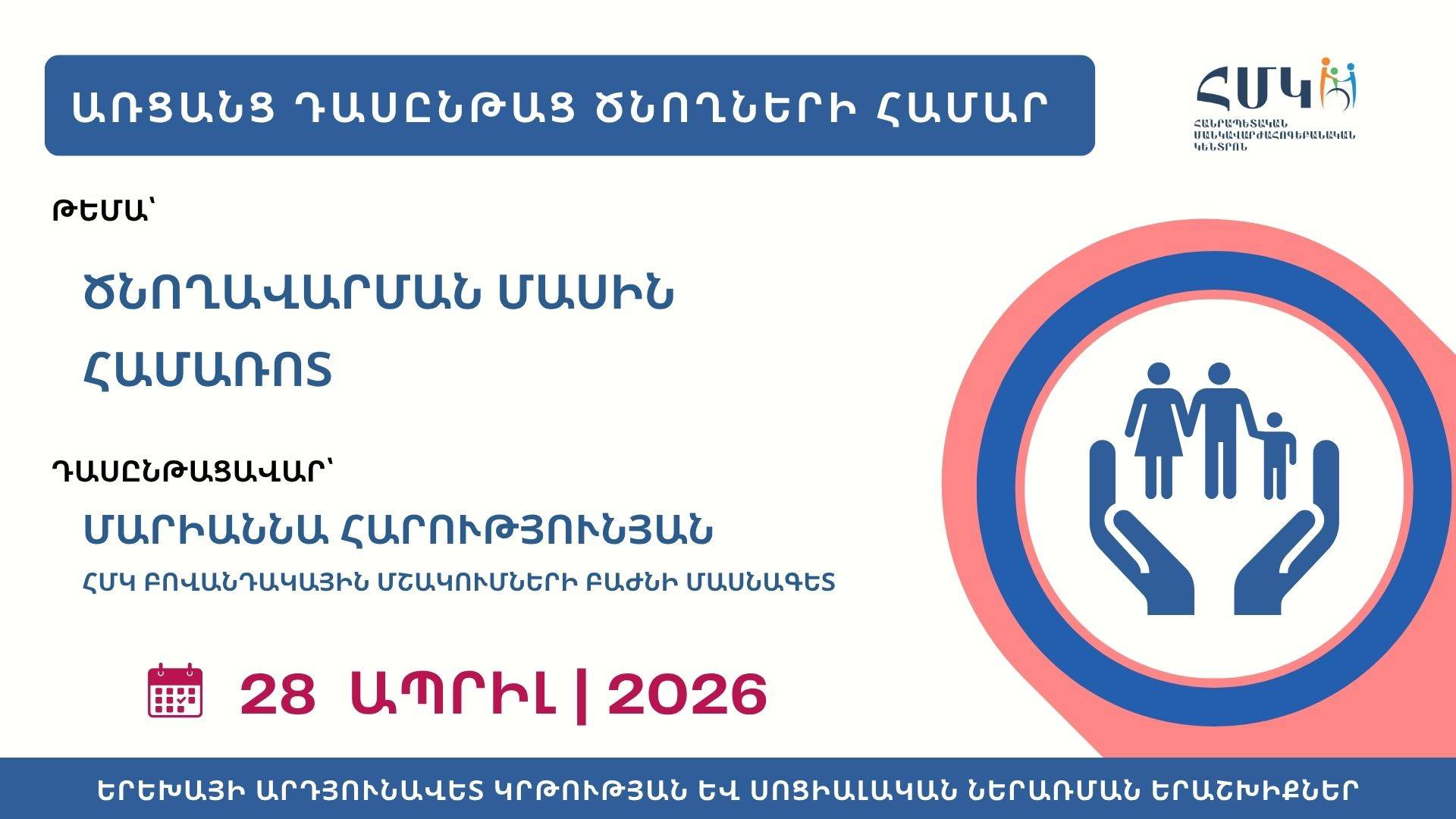 Ապրիլի 28, 2026 | «ԾՆՈՂԱՎԱՐՄԱՆ ՄԱՍԻՆ ՀԱՄԱՌՈՏ» թեմայով առցանց դասընթաց ծնողների համար
