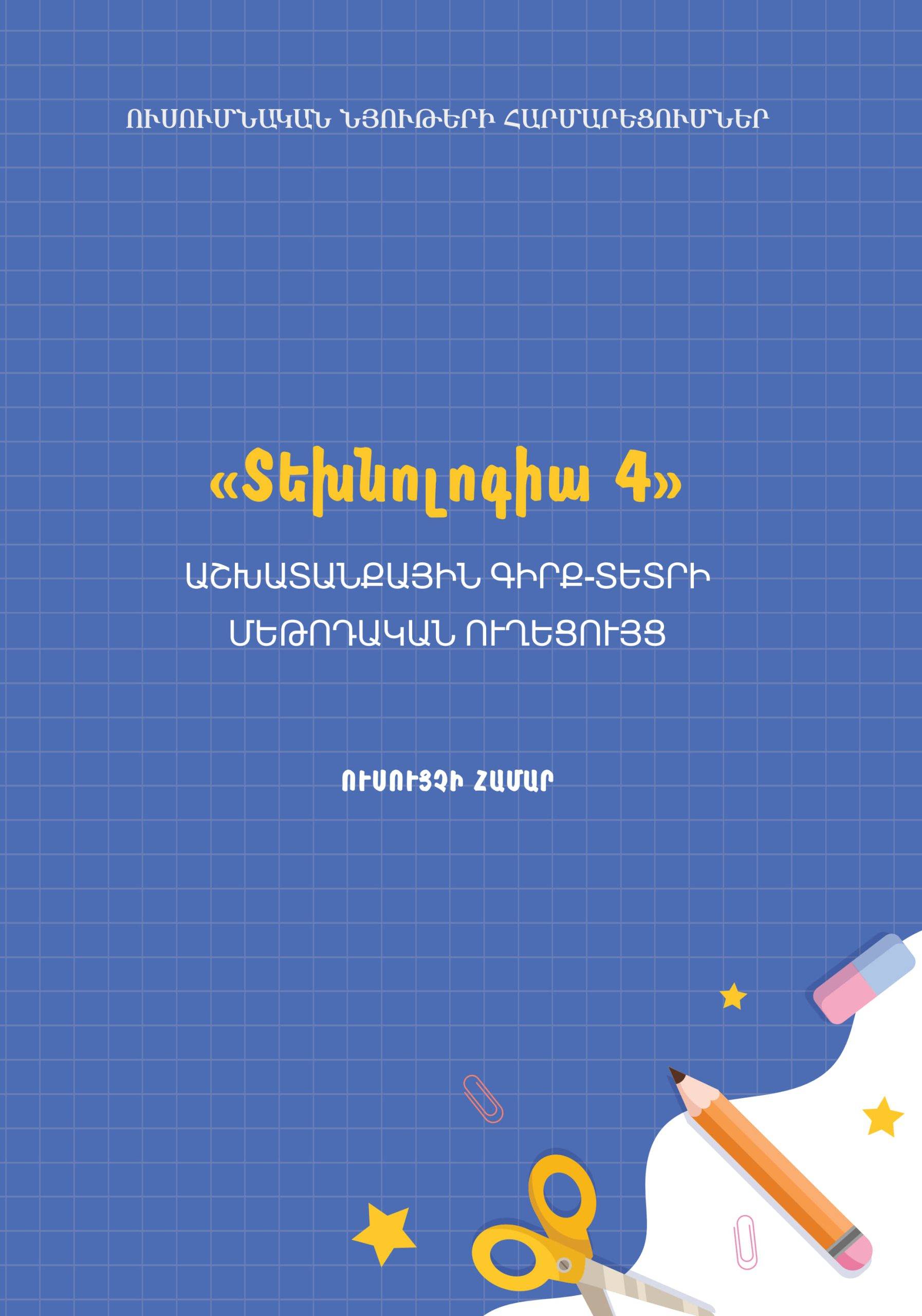 «Տեխնոլոգիա 4» աշխատանքային գիրք-տետրի մեթոդական ուղեցույցը յուրօրինակ մեթոդական քարտեզ է, որը ներառում է ցուցումներ գիրք-տետրում ընդգրկված առաջադրանքների իրականացման սկզբունքների, մոտեցումների, եղանակների, ուսումնառության առանձնահատկություններ ունեցող սովորողների համար դրանց մեկնաբանման և արդյունավետ կիրառումն ապահովելու վերաբերյալ: Ուղեցույցում ներկայացված են գիրք-տետրով աշխատելու մեթոդաբանությունը, մոտեցումները, յուրաքանչյուր առաջադրանքի իրականացման նպատակն ու տրամաբանությունը, կատարման քայլաշարն ու հաջորդականությունը։