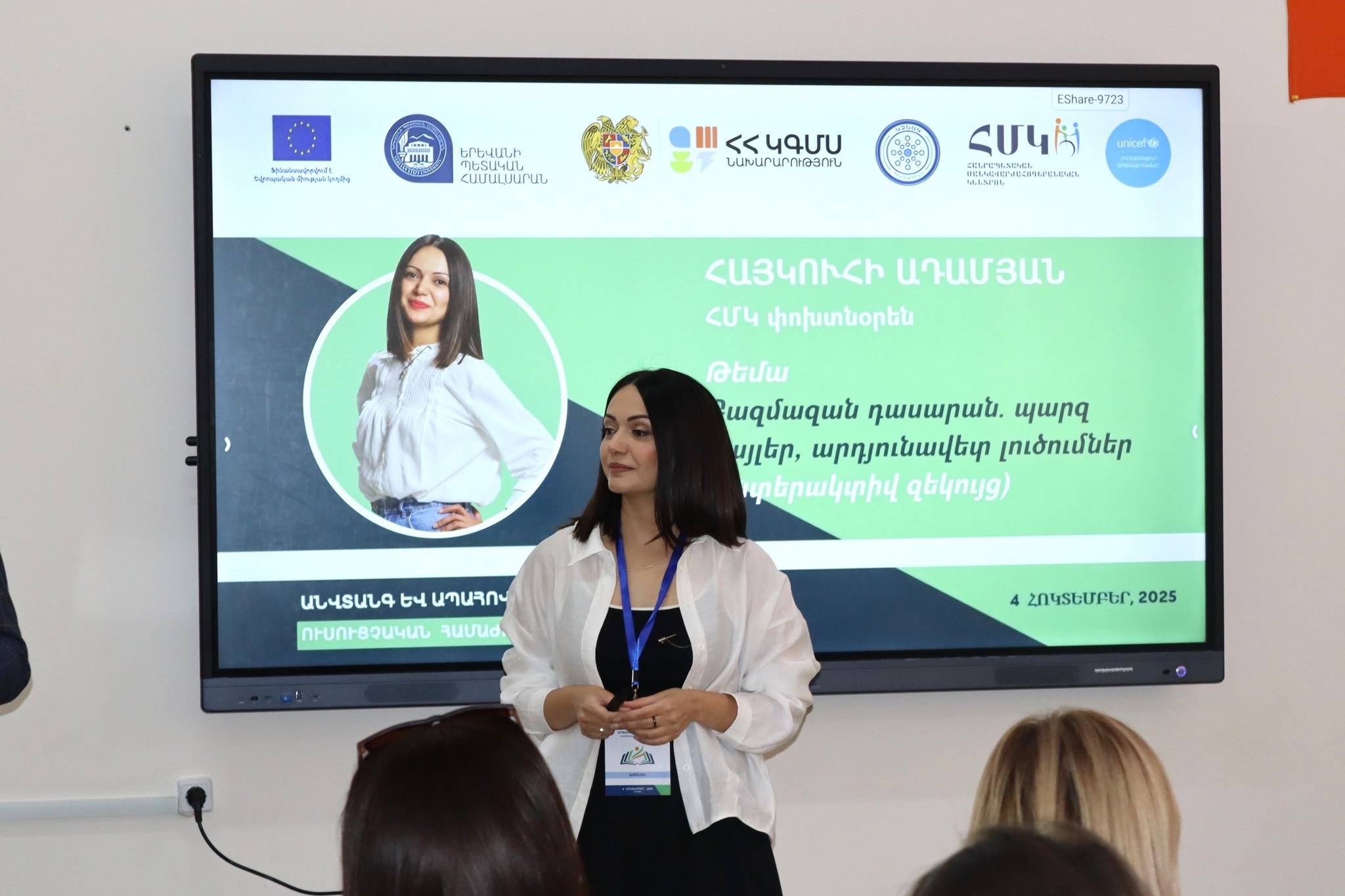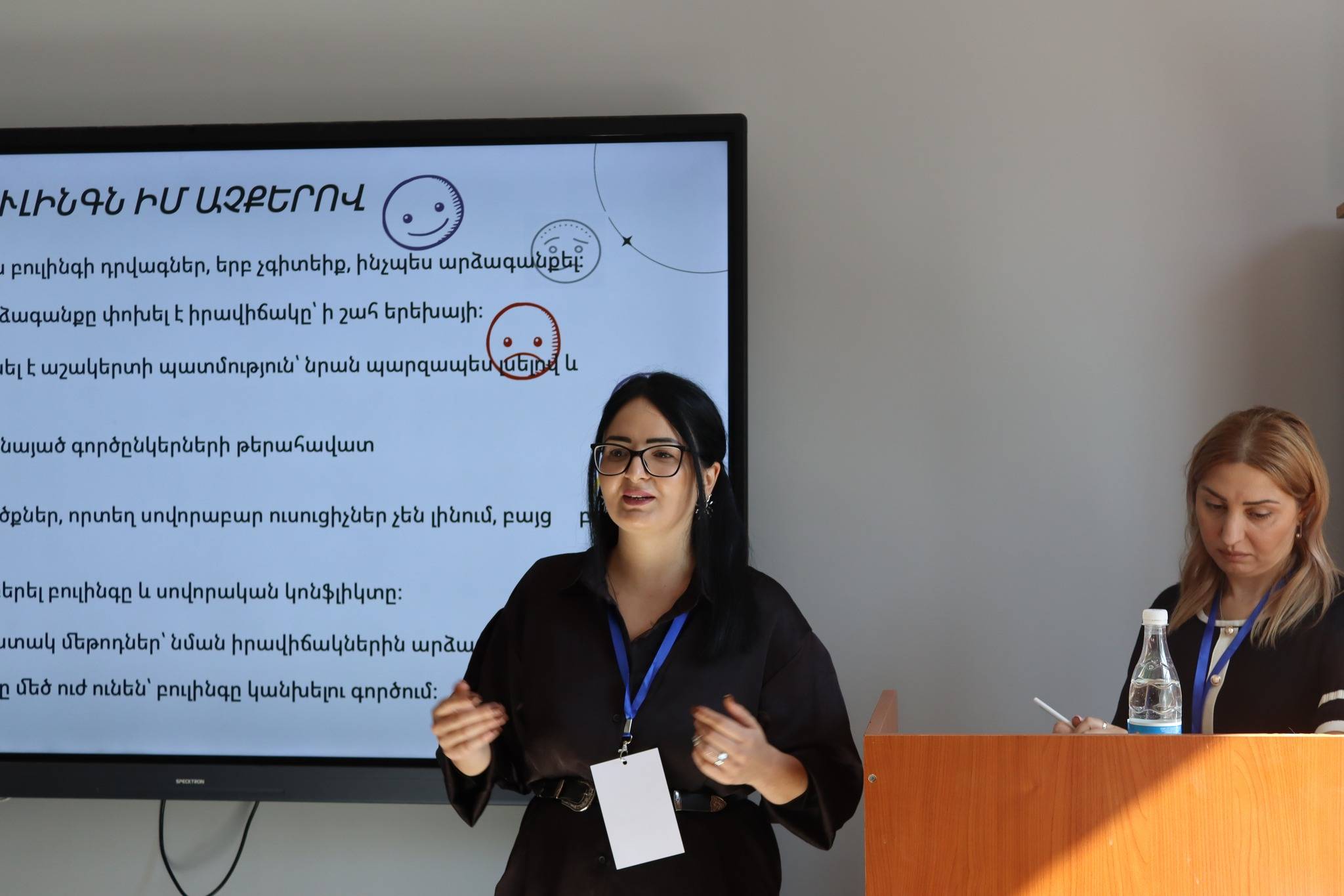 ՀՄԿ մանկավարժահոգեբանական աջակցության բաժնի հոգեբան Արմինե Ավագյանը ներկայացրեց զեկույց «ԲՈՒԼԻՆԳԻ ԿԱՆԽԱՐԳԵԼՈՒՄ․ ՈՒՍՈՒՑՉԻ ԴԵՐԱԿԱՏԱՐՈՒՄՆ ՈՒ ԱՐՁԱԳԱՆՔՄԱՆ ՔԱՅԼԵՐԸ» թեմայով՝ կարևորելով ուսուցչի գործառույթը բուլինգի կանխարգելման գործում։