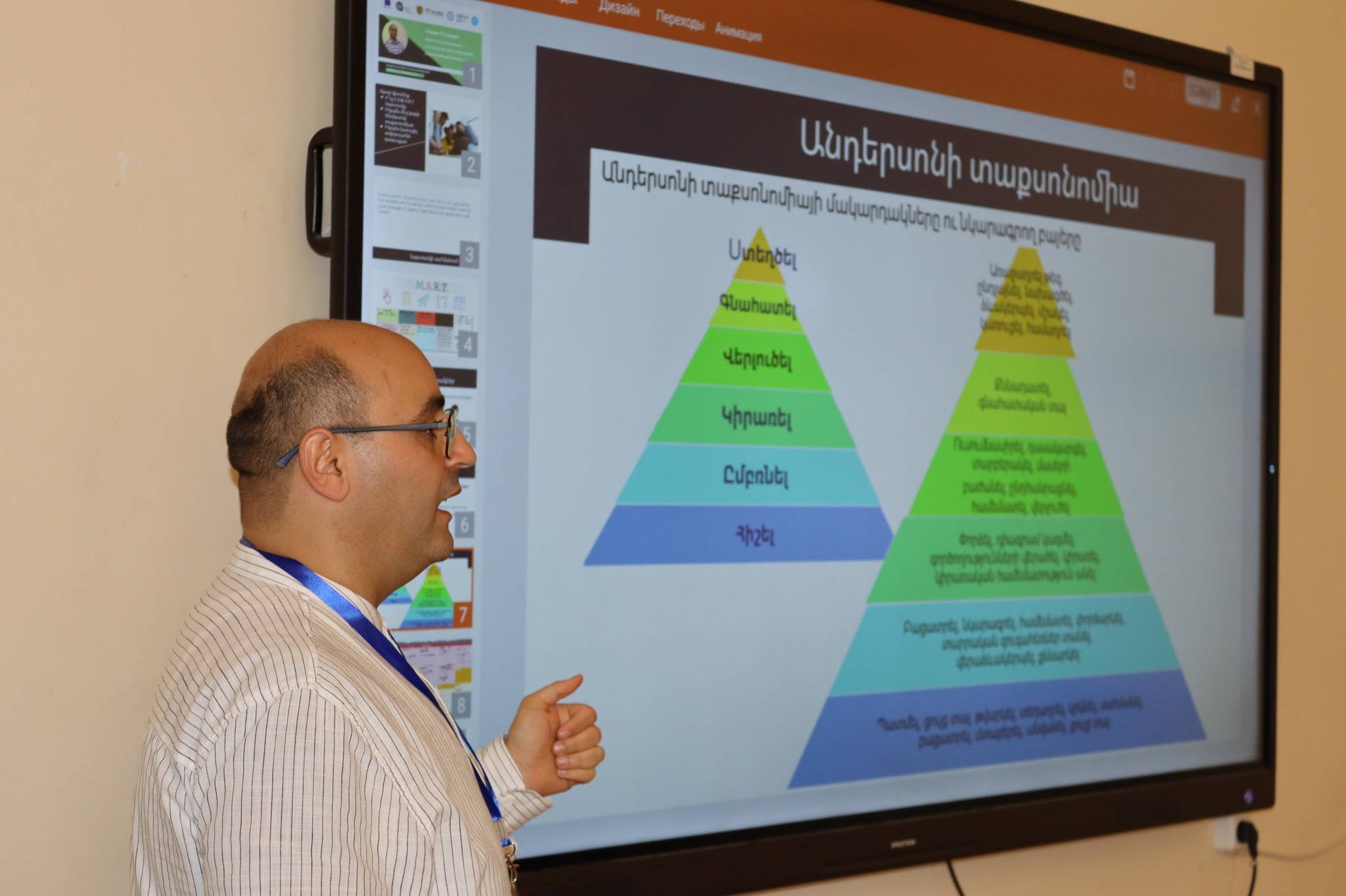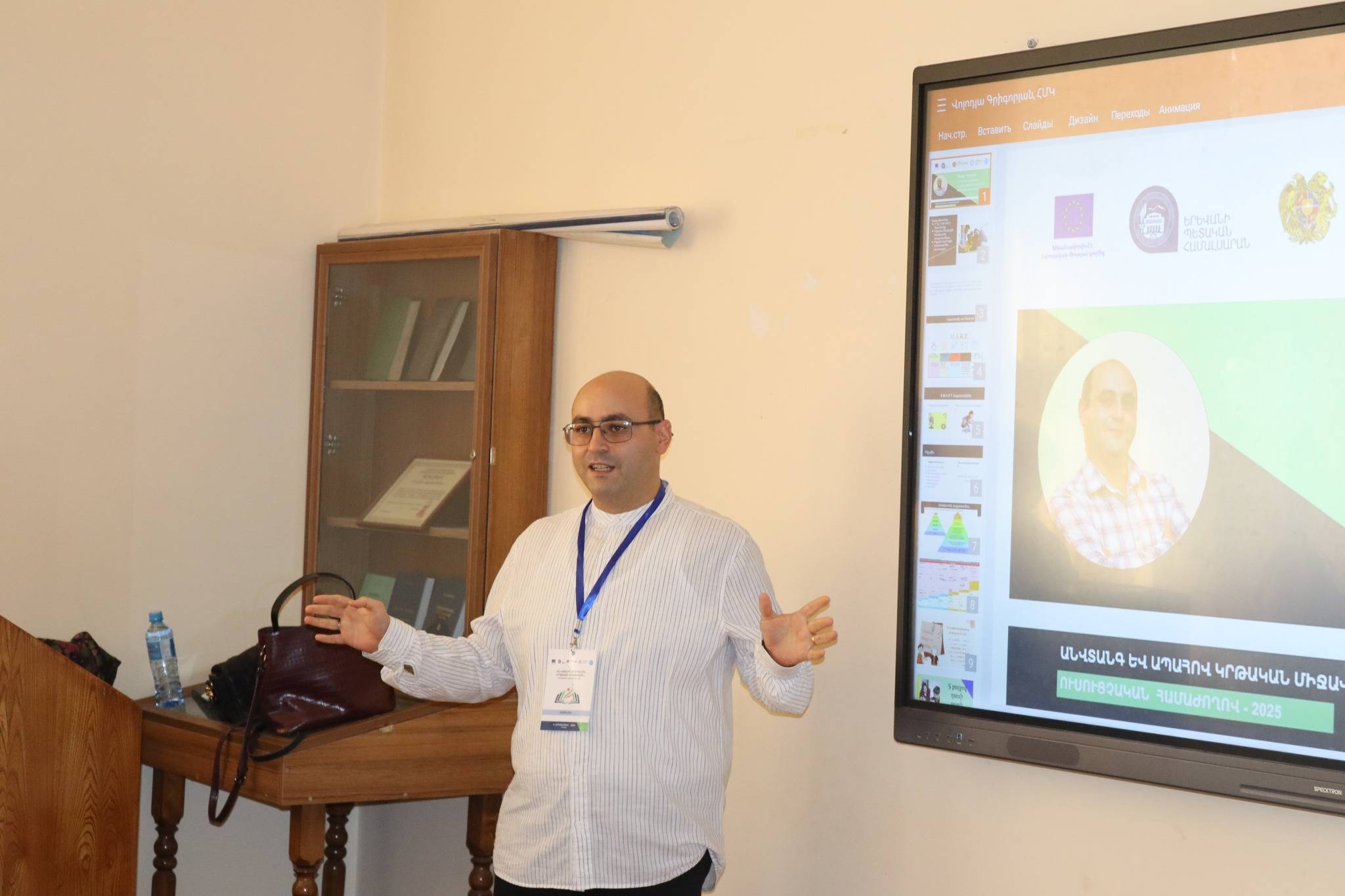 ՀՄԿ մենթորներ Վոլոդյա Գրիգորյանը և Աիդա Խալաթյանը, ովքեր հանդես եկան «ՍՈՎՈՐՈՂԱԿԵՆՏՐՈՆ ՈՒՍՈՒՑՄԱՆ ՄԻՋՈՑՈՎ ԱՇԱԿԵՐՏՆԵՐԻ ԻՆՔՆՈՒՐՈՒՅՆՈՒԹՅԱՆ ՁևԱՎՈՐՈՒՄ» և «ԴԱՍԱՎԱՆԴՄԱՆ ՄԵԹՈԴՆԵՐ ԵՎ ԿՐԹՈՒԹՅԱՆ ՈՐԱԿ․ ԺԱՄԱՆԱԿԱԿԻՑ ԼՈՒԾՈՒՄՆԵՐ ՈՒՍՈՒՑՉԻ ՀԱՄԱՐ» զեկույցներով, կիսվեցին աշակերտների հետ աշխատանքի իրենց փորձով՝ մասնակիցներին փոխանցելով սովորողակենտրոն մեթոդների և որակյալ կրթության ապահովման իրենց տեսլականը։