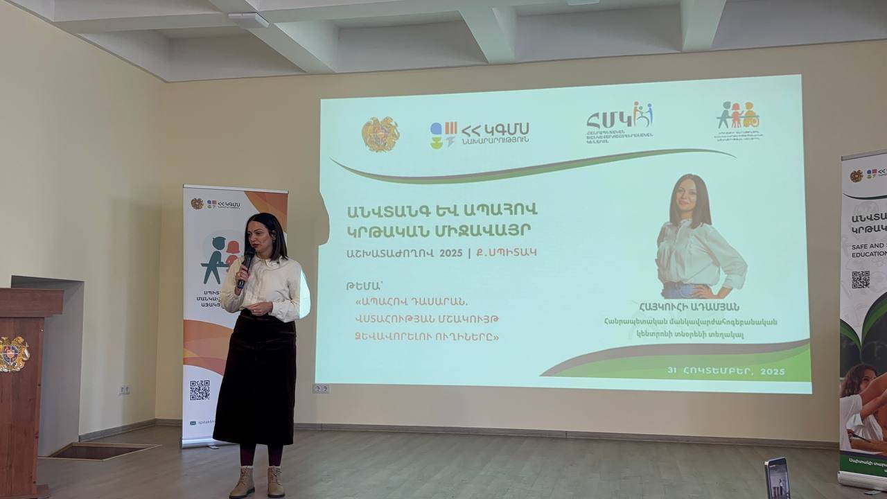 Լ․ Կարապետյանը ներկայացրեց զեկույց «ԱՊԱՀՈՎՈՒԹՅՈՒՆԸ ՈՐՊԵՍ ԶԱՐԳԱՑՄԱՆ ՆԱԽԱՊԱՅՄԱՆ» թեմայով՝ կարևորելով բոլոր առումներով ապահով միջավայրի առկայությունը ուսումնական հաստատություններում և դրա ազդեցությունը երեխաների ընդհանուր զարգացման վրա։